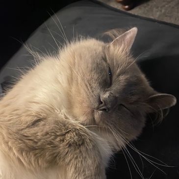 Freddy! Freddy is a Ragdoll, he is Penelope's son, he was born in our home and has the most laid back personality. He loves food and likes to stare at Grizz, who he secretly loves.